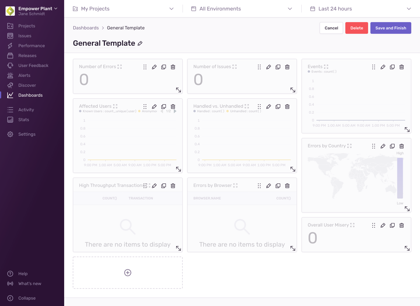 Clicking "Create Dashboard" takes you to a new dashboard where you can immediately begin adding widgets. When you're creating a new dashboard or editing an existing one, the widgets are slightly grayed out. From here, you can: