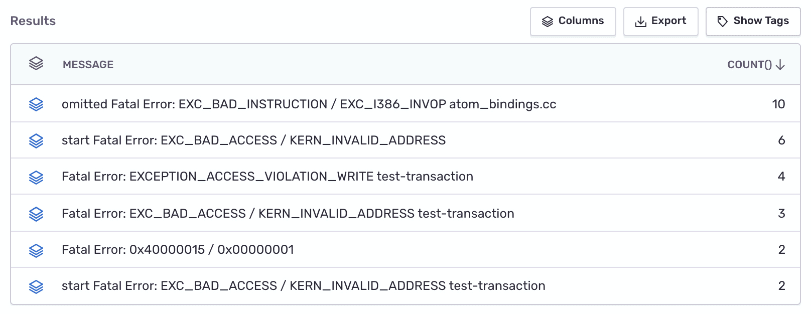 Whether your code is running on mobile, in browser, or on a server, an unhandled fatal error might crash your application. To find out where those crashes are happening, run the following query in Discover: